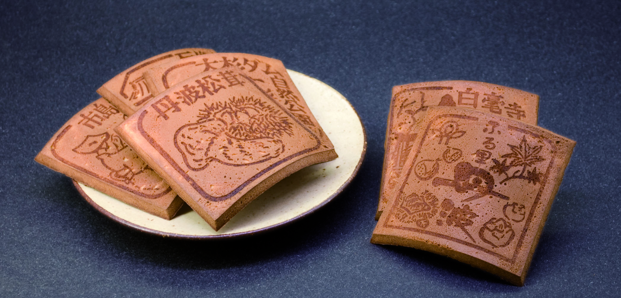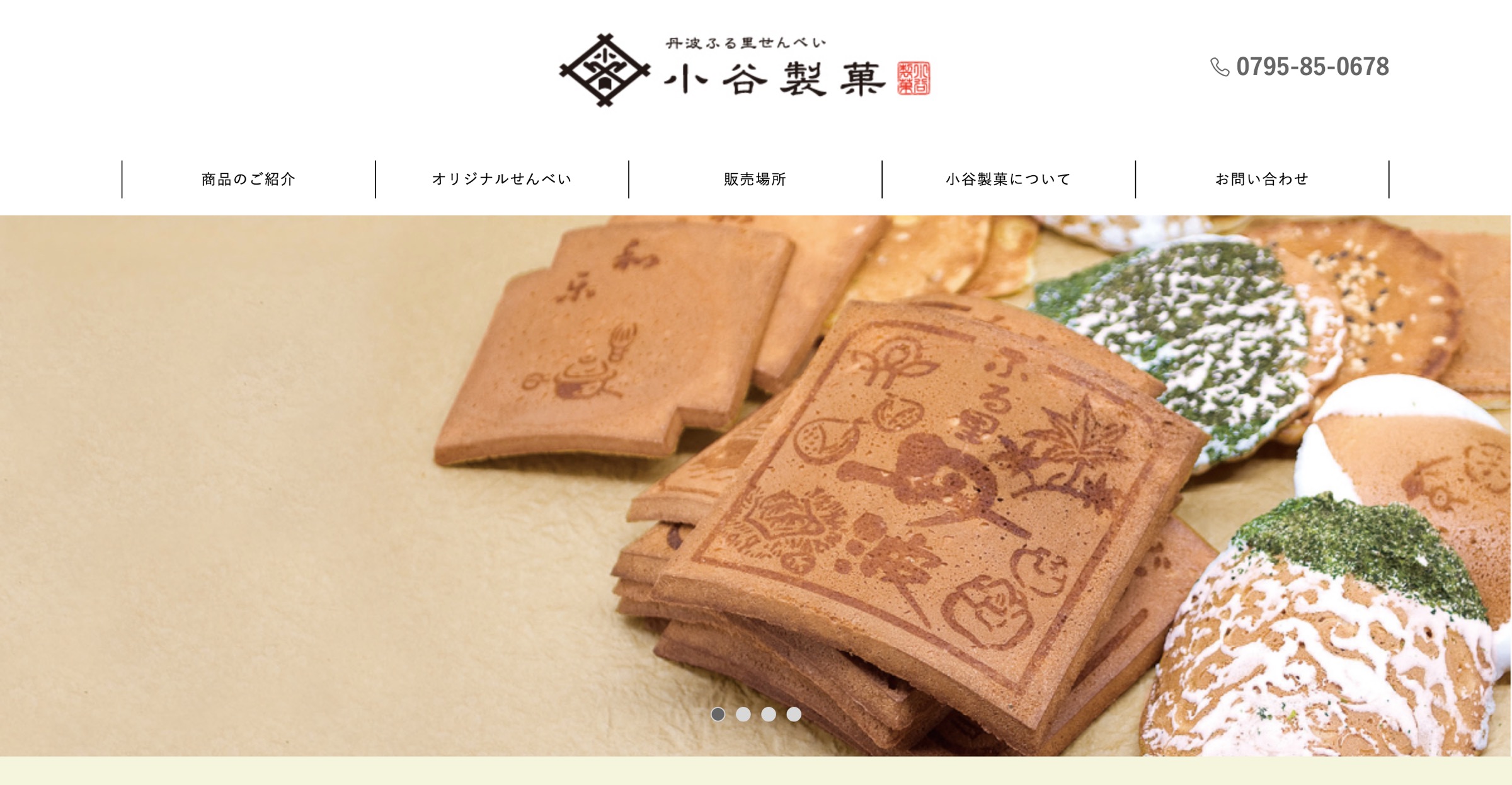 小谷:昭和23年より62年間、兵庫県丹波市市島町で地元の観光名所の焼印を押した、手作り瓦せんべいを製造しています。丹波市のマスコットキャラクター「ちーたん」をデザインしたおせんべい等も製造しており、子ども達に大人気です。店舗横の工場で、家族みんなで力を併せ、一枚一枚心を込めて焼いています。