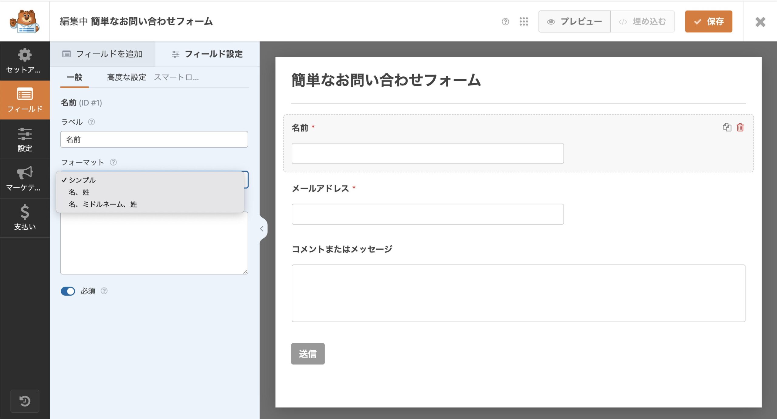 - フォームの名前に「お問い合わせ」と入力