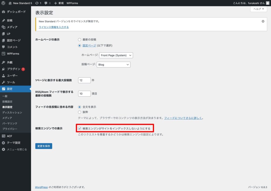 - 検索エンジンがサイトをインデックスしないようにする のチェックを確認