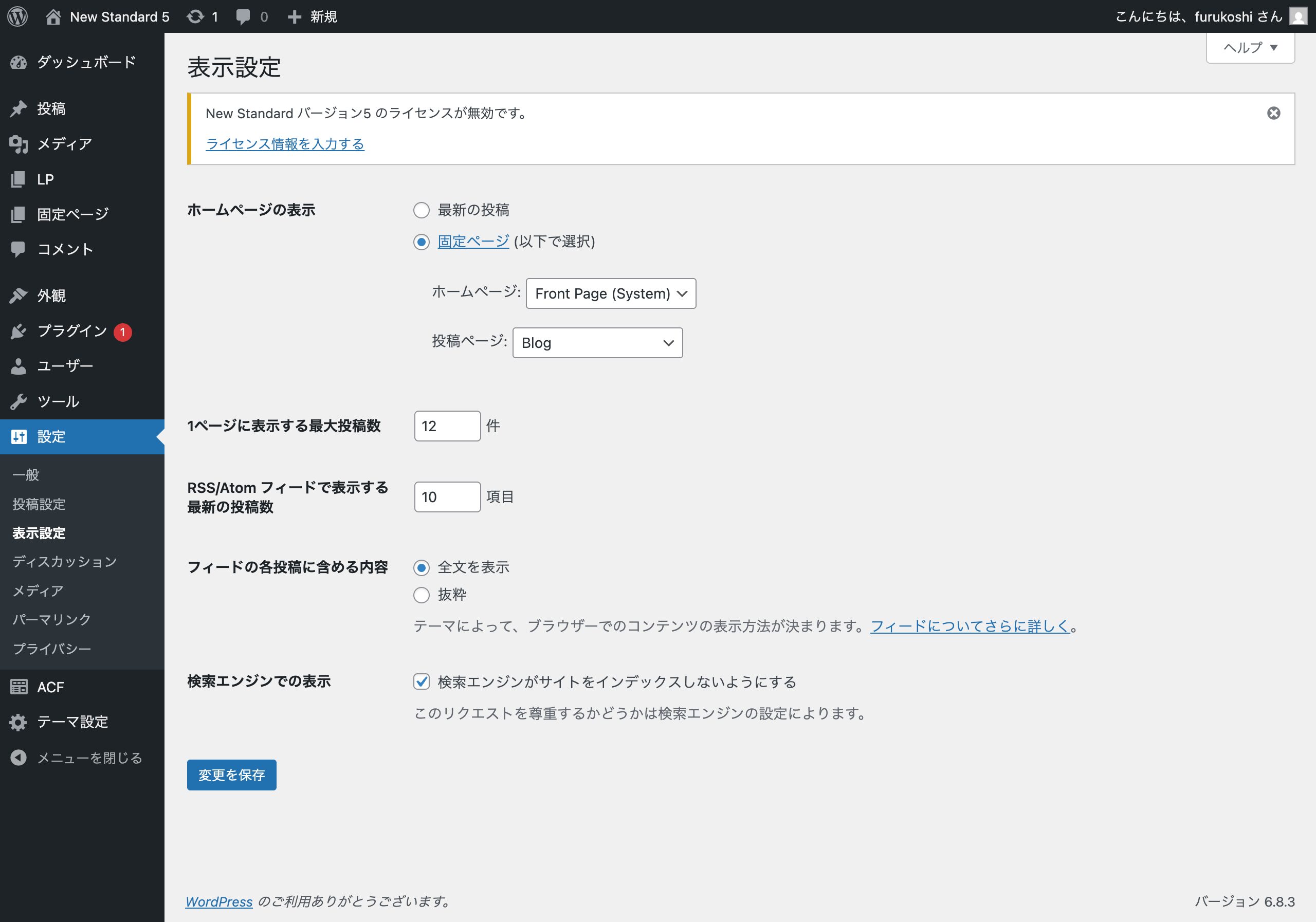 2. 「ホームページの表示」が 固定ページ になっているか確認